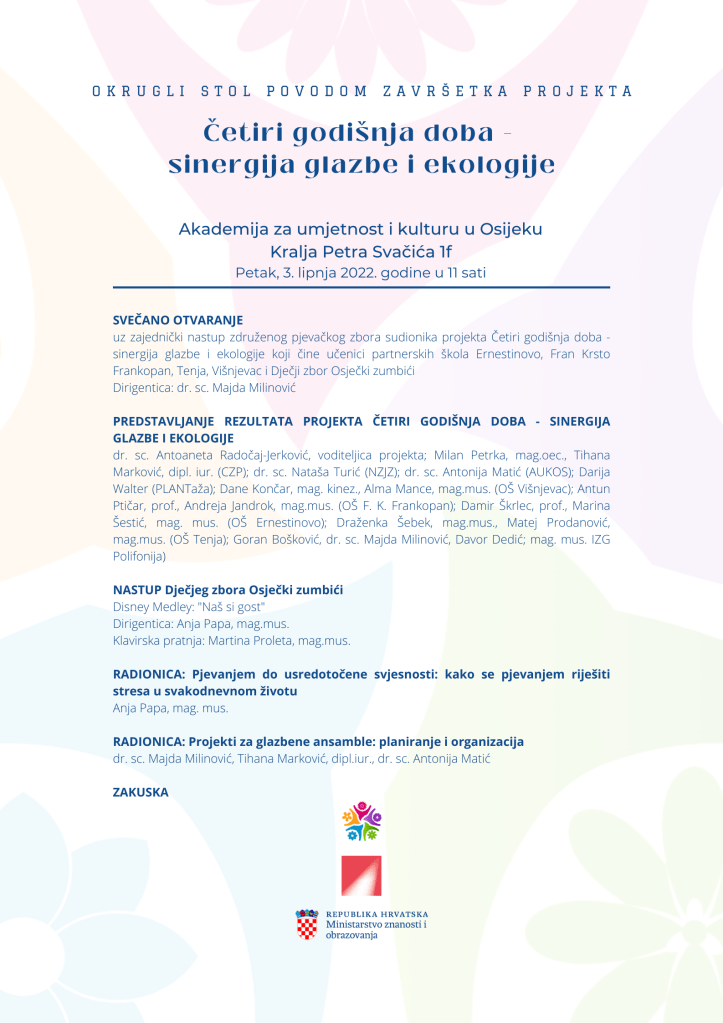 Na Akademiji za umjetnost i kulturu u Osijeku 3. lipnja 2022. godine održan je Okrugli stol na kojem su prestavljeni rezultati projekta Četiri godišnja doba – sinergija glazbe i ekologije koji je Institut za zborsku glazbu Polifonija u suradnji s partnerima: Nastavnim zavodom za javno zdravstvo OBŽ, Akademijom za umjetnost i kulturu u Osijeku, Centrom za poduzetništvo, Udrugom PLANTaža te osnovnim školama Višnjevac, Tenja, Ernestinovo i Fran Krsto Frankopan proveo u školskoj 2021./22. godini. U sklopu okruglog stola održane su i dvije radionice za učitelje glazbene kulture članove Županijskog stručnog vijeća učitelja glazbene kulture Osječko-baranjske županije, a koje korespondiraju s temom projekta.