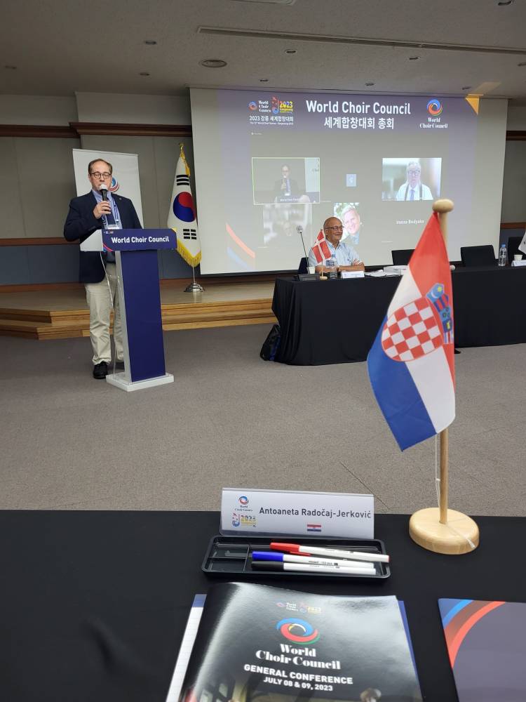 Profesorica Antoaneta Radočaj-Jerković sudjelovalo je kao predstavnica Republike Hrvatske na općoj skupštini World Choir Councila koja se od 7. do 9. srpnja 2023. održala u Južnoj Koreji u gradu Gangneungu. Glavna tema skupštine bila je razmatranje posljedica koje je pandemija virusa Covid 19 ostavila na zborski svijet. Opća skupština se tradicionalno održava svake dvije godine kao dio programa World Choir Games. Iako je zbog trenutne svjetske situacije opća skupština i ove godine održana u hibridnom obliku, u Gangenugu se okupio velik broj članova od ukupno 145 predstavnika World Choir Councila iz 96 zemalja što je svakako doprinijelo raspravi i razmjeni ideja među članovima.