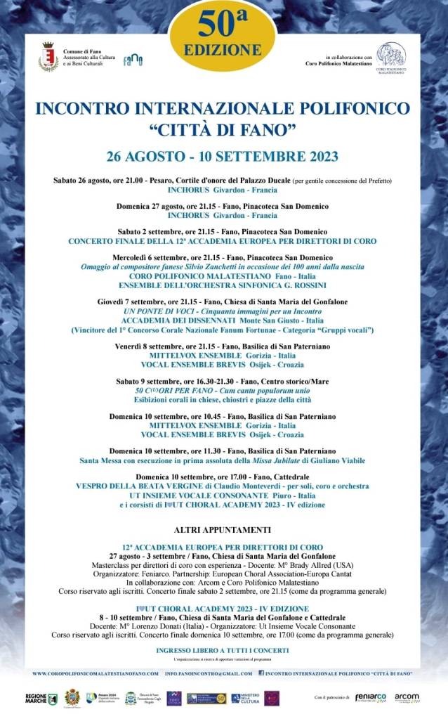 Koncertima na različitim lokacijama od kojih se ističu: samostanska crkva San Paterniano i Pinacoteca San Domenico, Vokalni ansambl Brevis sudjelovao je u proslavi 50-og jubilarnog izdanja ovog poznatog zborskog festivala. Anasmbl je izvodio skladbe hrvatskih i stranih skladatelja Papandopula, Matza, Juračića, Sunka, Bukvića, Grgoševića, Mendelssohna, Fauréa, Ešenvaldsa i drugih.